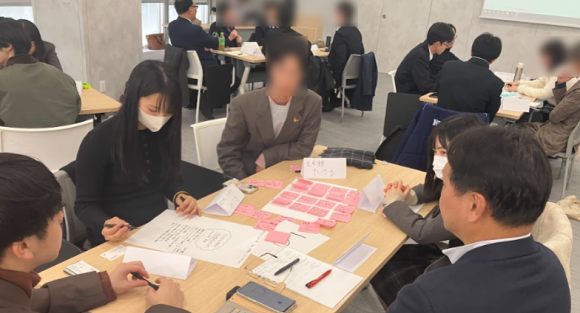 「未来と現実をつなぐ」をテーマにした幅広い世代で、京都だけでなく、長崎の高校や企業、大学、合計43名が参加し、参加者は様々な年代、属性によって構成された5名ずつのグループに分けられワークショップを実施しました。