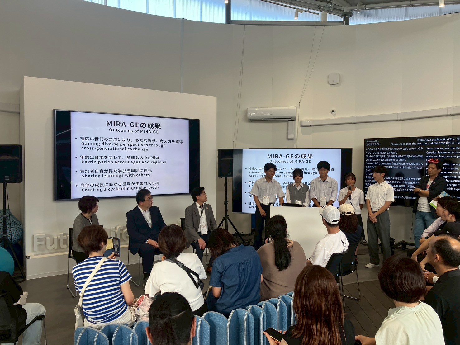 MIRA-GEを開催してきた中で、EXPO 2025 大阪・関西万博会場で高校生が世界に「高校生が主役の共創アクション」を発信している姿は頼もしさを感じました。当日は参加者の保護者や関係者の方含め多くの方にご覧いただくことができました。また、万博会場で本イベントを知って来場いただいた方は、こうした高校生の取組や宣言に大変感銘をうけて頂いておりました。