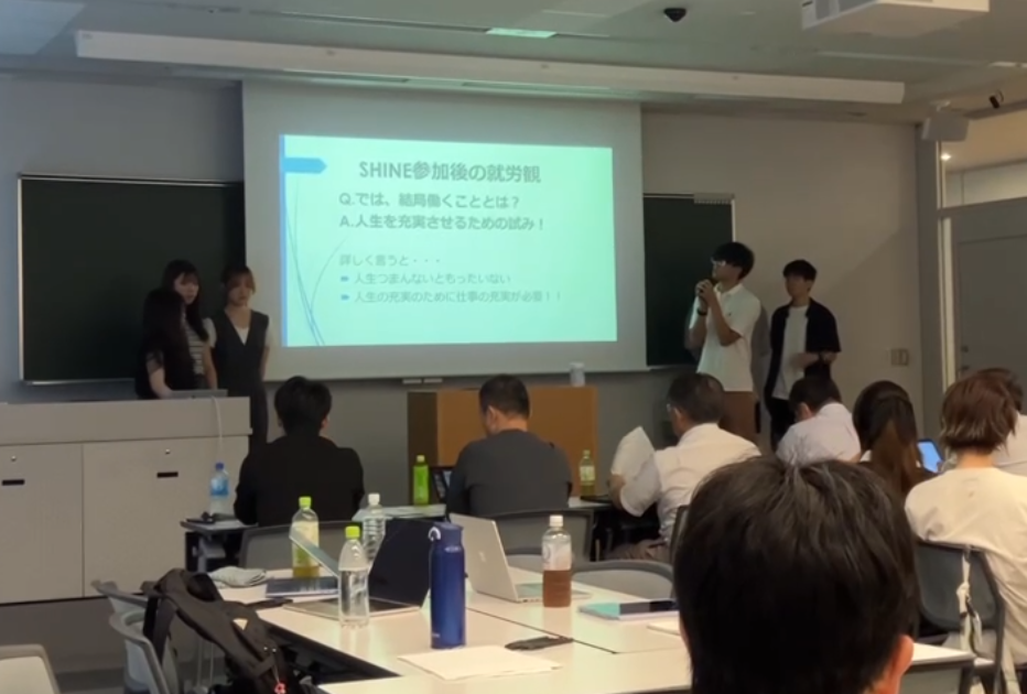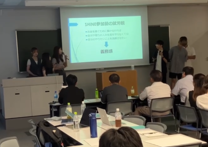 SHINE最終日には、チームごとに、プロジェクト参加前後で働くことに関する認識の変化や、各々の働く意義について、参画企業・行政の社会人を前にプレゼンテーションを実施しました。