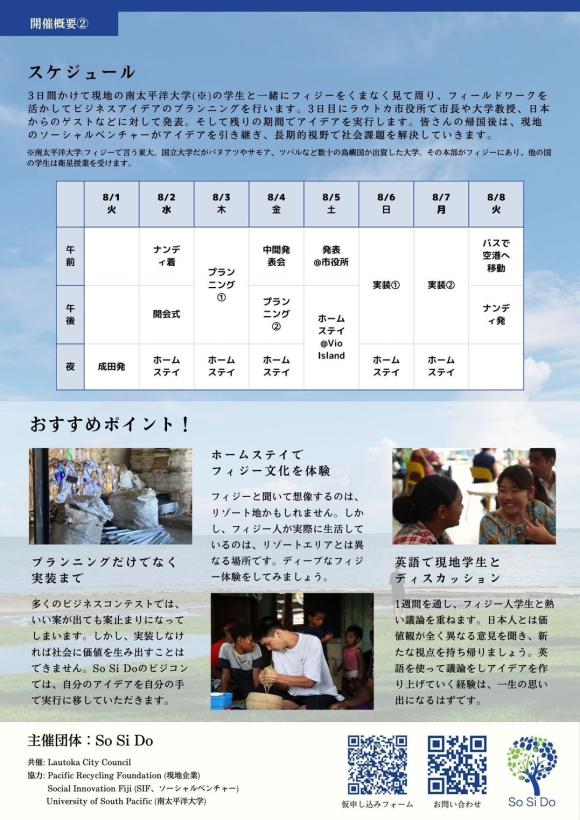 現在、8月のビジコンに向けてクラウドファウンディングをしています!支援していただいたお金は、ビジコン優勝チームの案を実装するために使います。リターンとして、フィジーのお土産やSoSiDoメンバーとの1on1など、幅広くご用意しております!ぜひ、ご支援よろしくお願いいたします。