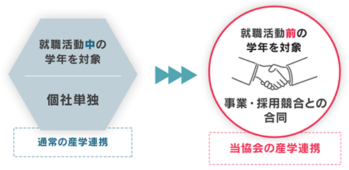 当協会は運営方針として「対象:就職活動【中】ではなく就職活動【前】」「座組:個社【単独】ではなく複数社【合同】」の2点を掲げています。進路の中立性を大事にする学校と中長期的な連携を図るためには、「自社に優秀な人財を入れるため」ではなく「日本に優秀な人財を増やすため」に施策を実施することが重要になります。そのため、採用活動とは一線を画すためこの2点を運営方針として掲げました。この点を理解した企業にのみ当協会が主催するプロジェクトに参画いただいております。