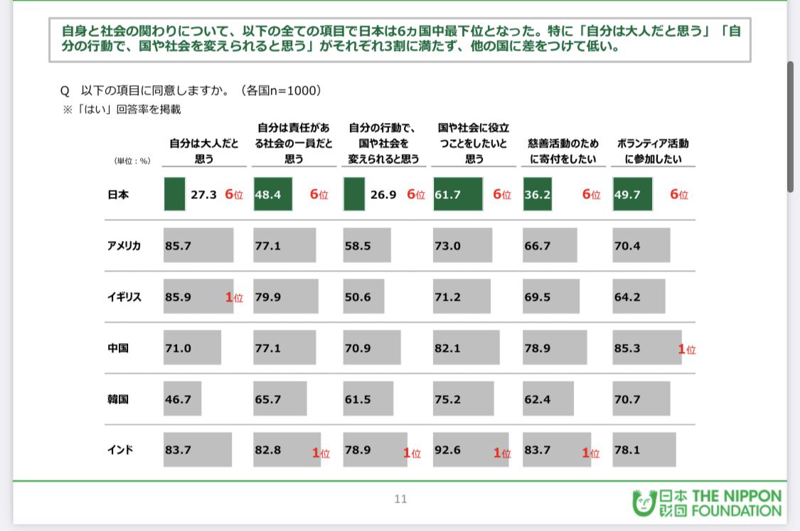 日本・アメリカ・イギリス・中国・韓国・インドの計六ヶ国の若者に、調査して判明したデータになります。